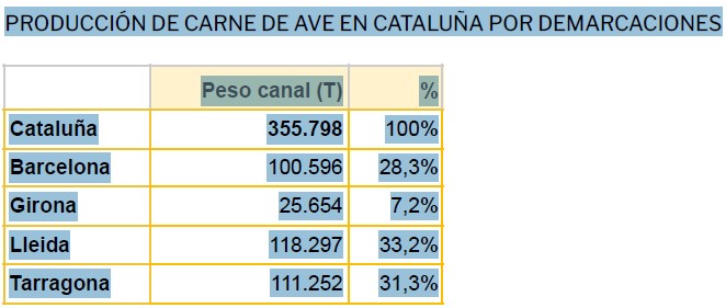 En relación al conjunto de la producción cárnica en Cataluña, las aves de corral representan el segundo lugar con un 14,1%, detrás del porcino (79,8%) y por delante del vacuno (5,3%).