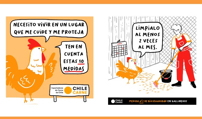 El uso de ilustraciones en esta campaña representa una innovación en la forma de comunicar las prácticas de bioseguridad a la vez que pone de manifiesto el compromiso permanente de parte de ChileCarne y sus colaboradores con la salud y el bienestar de la industria avícola nacional.
