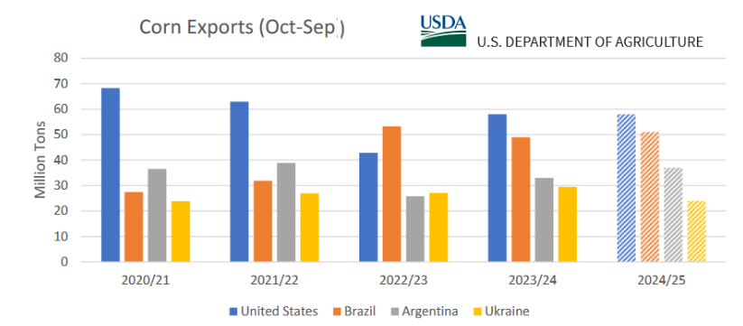 Es por esto que las proyecciones oficiales del USDA de la oferta de maíz 2024/25 para exportación tanto de Sudamérica como de Ucrania están marcadamente “infladas” y eso lo saben los importadores, reporta Bichos del Campo.