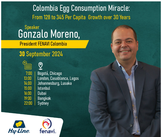 COLOMBIA -Únase a nosotros el 30 de septiembre en el seminario web "El Milagro del Consumo de Huevos en Colombia: un crecimiento en 30 años de 128 a 345 huevos consumidos per cápita", seminario web que estará a cargo de Gonzalo Moreno, presidente de FENAVI Colombia.