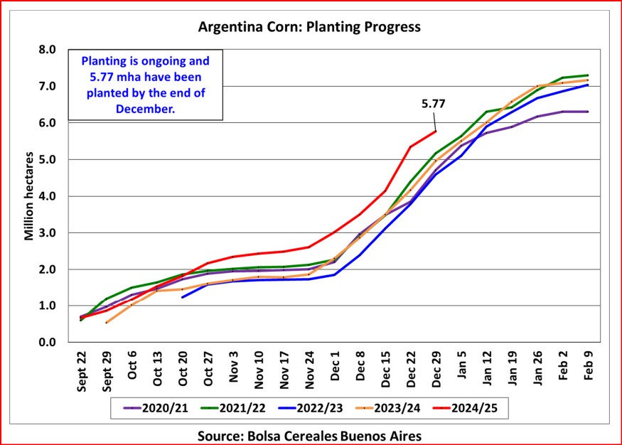 A fines de diciembre, la siembra de maíz está completa en un 87 por ciento y la siembra continuará hasta enero. Los agricultores argentinos plantaron este año más maíz de siembra temprana (maíz plantado antes del 1 de diciembre), que en años anteriores, porque el maíz de siembra temprana en gran medida no se vio afectado por la infestación de chicharrita el año pasado.