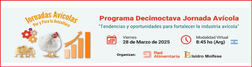 La Decimoctava Jornada Avícola tendrá lugar el 28 de marzo de 2025, en modalidad virtual, a las 8.25 am hora de Argentina.