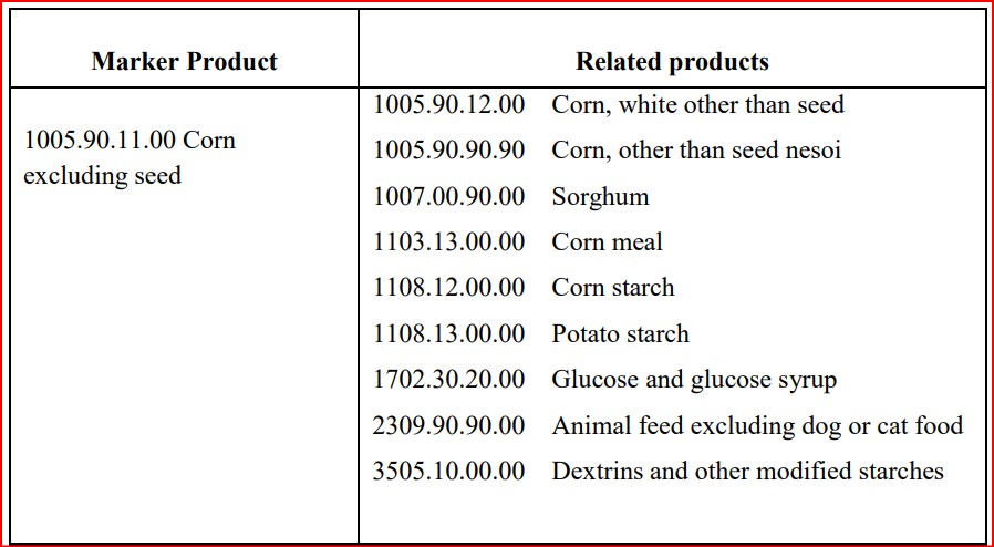 Productos de maíz afectados por el Sistema de Bandas de Precios peruano