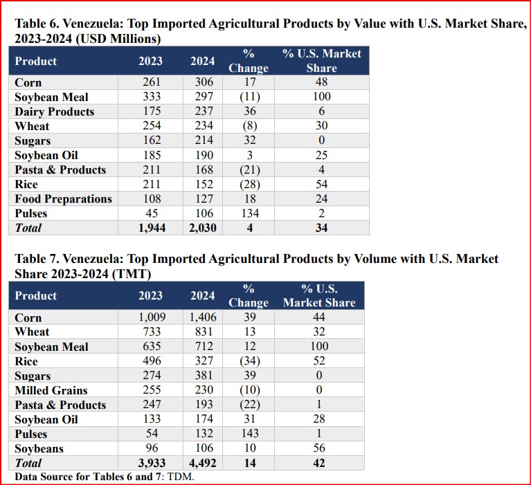 Las importaciones venezolanas de maíz y harina de soya de los EUA aumentaron en volumen un 153 % y un 14 % interanual, respectivamente, debido a precios competitivos y una mayor demanda de alimento para apoyar la recuperación de la industria avícola. De igual manera, las importaciones de arroz, trigo y aceite de soya estadounidenses aumentaron significativamente, impulsadas también por precios competitivos y la mejora de las condiciones económicas que respaldaron las importaciones.