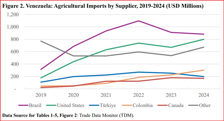 Desde 2019, las importaciones agrícolas venezolanas han aumentado un 111% en valor y un 65% en volumen, impulsadas por la liberalización económica, el fin de la hiperinflación y una mayor participación del sector privado en el comercio. Entre los países con los mayores aumentos en los volúmenes de exportación a Venezuela se encuentran Canadá (612%), Estados Unidos (364%), Argentina (270%), Brasil (126%) y Turquía (47%).