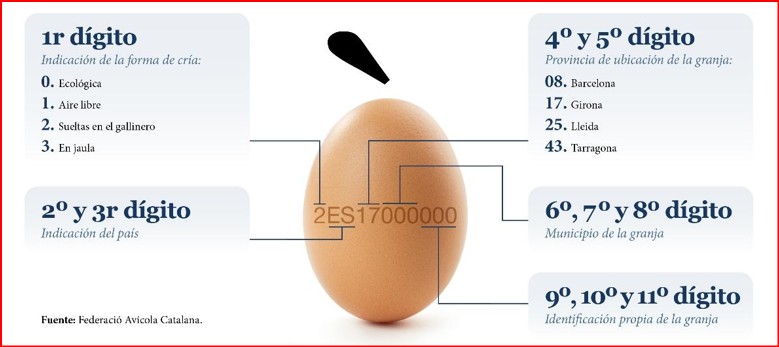 El código del huevo es la serie de números y letras que llevan impresos en la cáscara. Este código hace posible la trazabilidad del huevo, ya que permite conocer la granja de donde proviene. Los dígitos que componen el código ofrecen diferentes datos sobre el origen del huevo y nos permiten conocer desde el sistema de cría de la gallina ponedora hasta su procedencia.