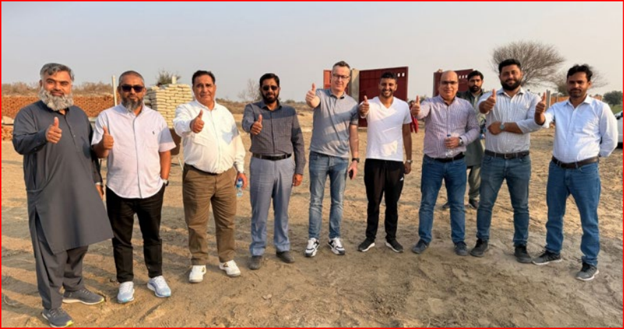 Durante la visita al sitio, Hubbard y Noor Poultry expresaron su entusiasmo por el excelente progreso en la construcción de las granjas e incubadoras de Abuelos en el desierto de Thal.