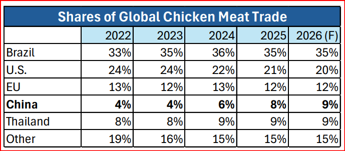 Las exportaciones de carne de pollo de China continúan disparándose en 2026, superando a las de Tailandia.