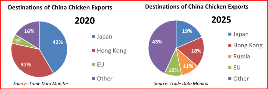Ante una población en contracción y envejecimiento —sumado a un limitado crecimiento del consumo per cápita—, el aumento de la producción en China supera el modesto incremento del consumo, lo que propicia un alza en la oferta exportable. El nicho de mercado de China a nivel global consiste en el suministro de carne de pollo a precios bajos. La demanda proveniente de países de ingresos bajos y medios-bajos ha impulsado las exportaciones chinas de carne de pollo, tal como lo demuestra el crecimiento de los envíos a Camboya, Kirguistán, Irak y diversas naciones de África.