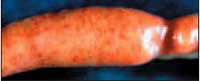 | Small intestines affected by Eimeria maxima. The middle sample is opened to show white spots. |