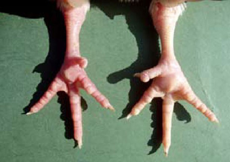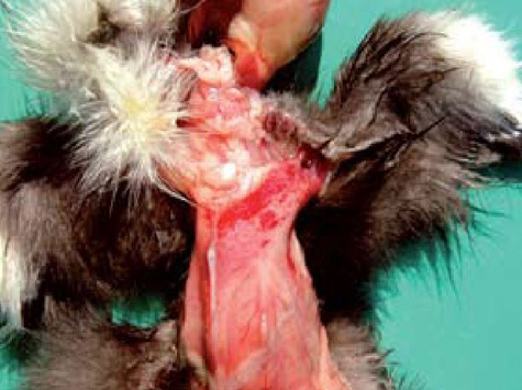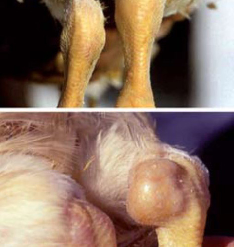 8.- Se encuentra artritis (arriba) y periartritis (abajo) en aves de carne así como en aves en crecimiento. Las articulaciones tibio tarsales son las más comúnmente afectadas. La piel y las cubiertas mucosas son la puerta de entrada de la infección. La prevención se basa en la detección y eliminación del agente causal. Es esencial mantener una higiene estricta en las incubadoras y en la introducción de inyecciones en aves para poder prevenir la infección de Pseudomonas. La prueba de aislamiento y sensibilidad a antimicrobianos es de mucha importancia para el tratamiento debido a que el microorganismo es resistente a un alto número de drogas antimicrobianas.