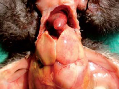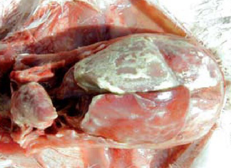 5.- Infección aguda septicémica de P. aeruginosa. Se describe en estos casos inflamación serofibrinosa de las membranas serosas en la cavidad pleuroperitoneal (aerosaculitis, pericarditis, y perihepatitis). Las lesiones se asemejan fuertemente a aquellas observadas en la septicemia por E. coli.