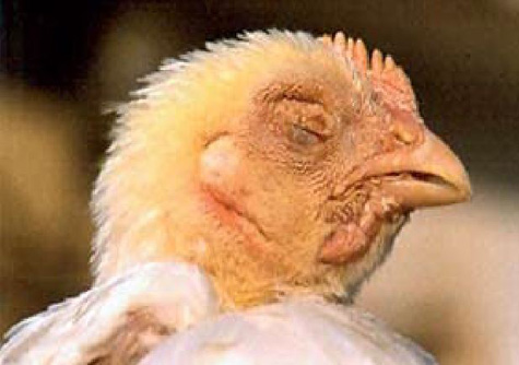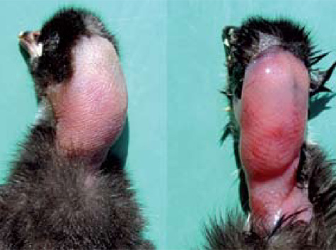 1.- Infección por P. aeruginosa causada por vacuna inyectable de Marek. Cerca de 24 horas después de la vacunación, aparecen signos nerviosos, incoordinación, ataxia, cojera unilateral (si la vacunación es manual). Los pollitos vacunados automáticamente exhiben edemas subcutáneos en la región del cuello, envolviendo a veces la cabeza.
