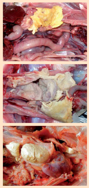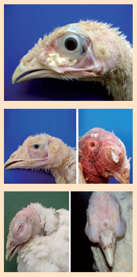 7, 8, 9.- M. gallisepticum produce sinusitis infecciosa en pavos. Se puede observar en los pavos hinchazón unilateral o bilateral de los senos periorbitales, descarga nasal y conjuntivitis. En pavos, se observa hinchazón bilateral o unilateral de los senos periorbitales, descarga nasal y conjuntivitis. El exudado inflamatorio se presenta principalmente fibrinoso y se detecta como una acumulación difusa después de remover la piel circundante.