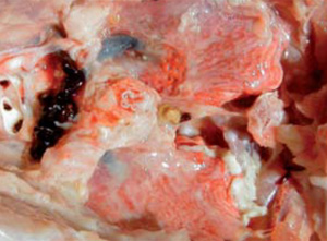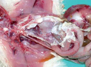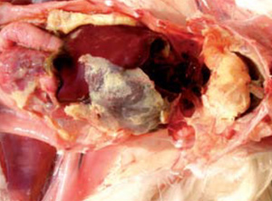 4.- Se encuentra frecuentemente neumonía serofibrinosa, usualmente bilateral. Las aves pueden llevar los microorganismos y ser asintomáticas hasta que la enfermedad se dispara por factores de estrés como cambios en la dieta o el clima, vacunaciones o infecciones de IB o ND, niveles incrementados de polvo o amoníaco.