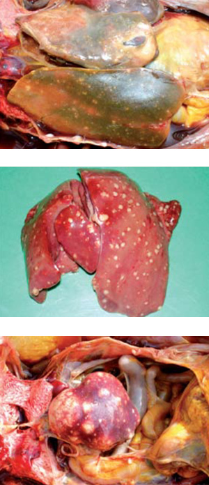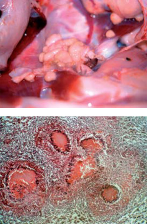 7, 8.- La tuberculosis aviar se presenta de manera característica en forma de tubérculos conglomerados (apariencia macroscópica e histológica). El diagnóstico se basa en la evaluación de la historia, mortalidad persistente en lotes de adultos y los hallazgos anatomopatológicos. La tuberculosis aviar debe ser diferenciada de las enfermedades neoplásicas, coligranuloma (enfermedad de Hjarre), pullorosis, etc. No se recomienda el tratamiento ya que la enfermedad es contagiosa para el hombre.