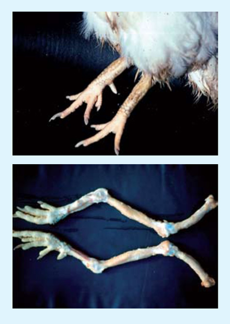 1, 2.- La osteopetrosis es una enfermedad neoplásica, relacionada etiológicamente con el grupo de virus L/S. Se caracteriza por un engrosamiento significante del periostio de los huesos. La diáfisis de la tibia y los huesos tarso metatarsianos se encuentran afectados frecuentemente. A menudo la osteopetrosis se observa simultáneamente con LL en la misma ave.
