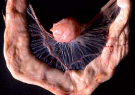 1.- El leiomioma del mesosalpinx es un tumor común en gallinas. Usualmente, se localiza en el ligamento ventral del oviducto. Los nódulos varían de talla de pequeños o grandes (de diversos cm en diámetro) lisos, engrosados, algunos altamente vascularizados.