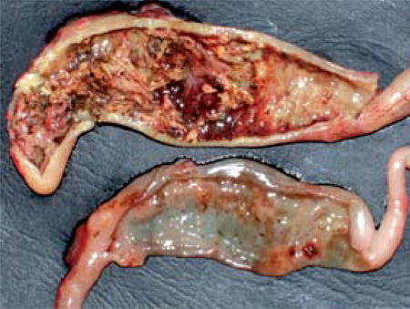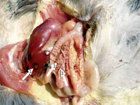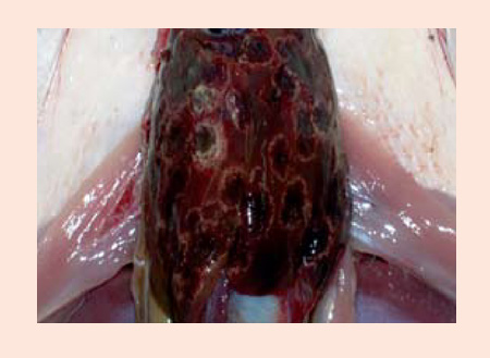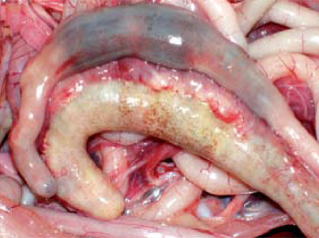 2.- Desde el punto de vista anatomopatológico, se observa agrandamiento bilateral del ciego con engrosamiento de sus paredes. El agente etiológico es Histomona meleagridis, un flagelado polimórfico que está presente como flagelado en el ciego y como ameba en los tejidos. Los trofozoitos sobreviven por diversas horas en el ambiente, pero en los huevos de Heterakis, ellos permanecen infectivos más de un año. A menudo, la presentación de tiflitis es la causa de la peritonitis adhesiva.