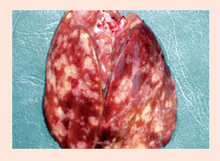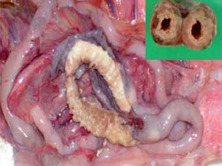 4.- En casos antiguos, las costras de masas caseosas densas se forman dentro del ciego, engrosan la pared intestinal y reduce el lumen (parte superior derecha: sección transversal a través del ciego.