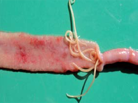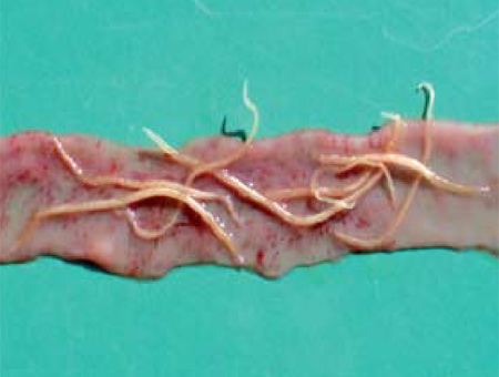 2.- Anatomopatológicamente se encuentran hemorragias de intensidad variada en la mucosa intestinal, enteritis hemorrágica catarral e incluso se pueden observar a los propios parásitos.