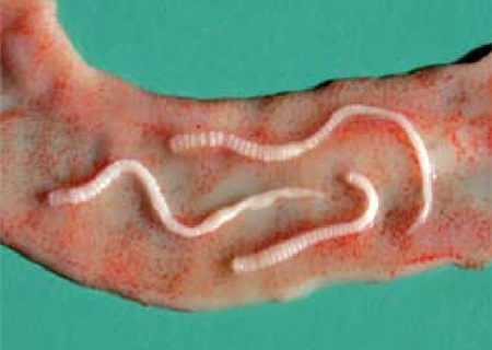 1.- La Raillietinosis es una enfermedad producida por céstodos, caracterizada por diarrea (algunas veces sanguinolenta) durante el estado agudo y emaciación, caquexia y anemia durante la fase crónica. Está causada por algunas especies del género Raillietina que parasita varias áreas del intestino delgado. Los hospedadores intermediarios más frecuentes son las hormigas y otros insectos. Pato anatómicamente se observan hemorragias de variada intensidad en la mucosa intestinal, enteritis hemorrágica catarral y los propios parásitos durante la observación macroscópica. El tratamiento y el control se realizan por desparasitación de todas las aves de la granja afectada.