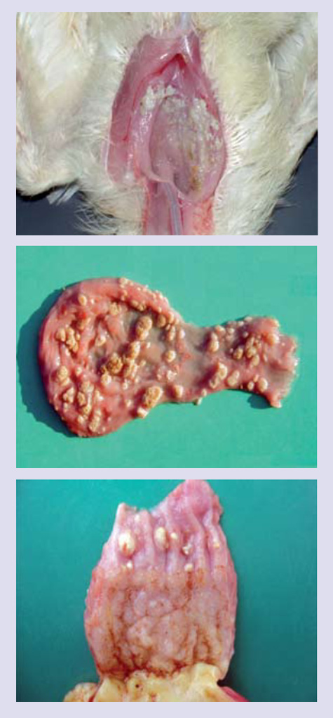 1, 2, 3.- La candidiasis es una enfermedad del tracto alimentario, causada por la levadura Candida albicans y se produce principalmente como una infección secundaria. Los factores predisponentes son: la falta de higiene, tratamiento prolongado con antibióticos, deficiencias de vitaminas, infecciones parasitarias severas e inmunodeficiencias. La producción de una endotoxina soluble también contribuye a la patogenicidad del agente. Las lesiones se detectan principalmente en el buche, labios, esófago, pero pueden afectar también el proventrículo y rara vez los intestinos. La mucosa afectada se encuentra engrosada de manera difusa o focalizada, elevada y arrugada, de color blanco, de aspecto parecido a una toalla. Posiblemente las lesiones se pueden observar como cubiertas pseudomembranosas o difteroides. El estudio histológico confirma el diagnóstico, por la aparición de hifas fungales en la mucosa infectada. Se puede usar solución de sulfato de cobre en dilución de 1:2000 para prevenir y controlar la enfermedad. La aplicación de nistatina en agua o alimento es eficiente contra la candidiasis en pavos.