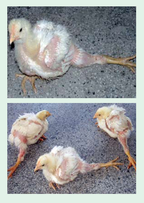 1,2.- La perosis o condrodistrofia se presenta en aves jóvenes en cuya dieta hay deficiencia de manganeso o algunas de las siguientes vitaminas: colina, ácido nicotínico, piridoxina, biotina o ácido fólico. Se presenta como una deformación de los huesos de las patas en pollitos, patitos y crías de faisanes etc. Se caracteriza por crecimiento retardado en huesos largos, engrosamiento de la articulación tibio metatarsal, torsión o doblaje del extremo distal de la tibia o del extremo proximal del metatarso, y finalmente desplazamiento del tendón del músculo gastrocnemio de sus cóndilos. Clínicamente se manifiesta por daño en la locomoción debido a posición lateral y mala posición posterior de la pierna.
