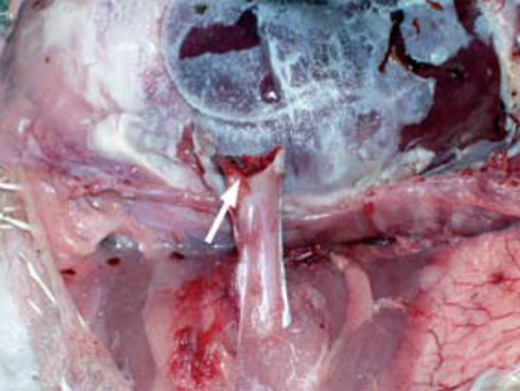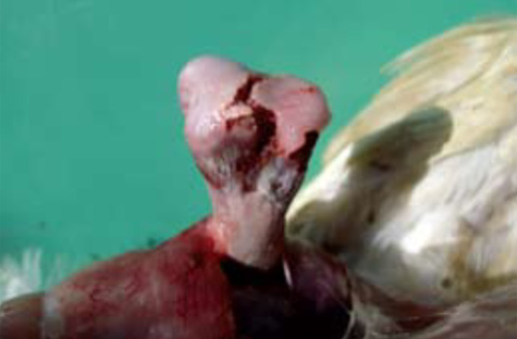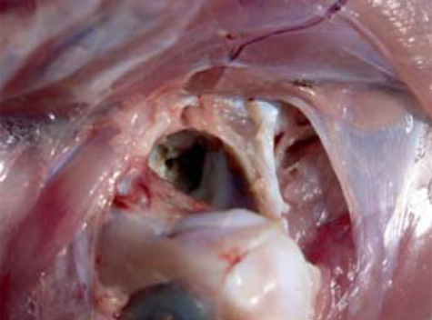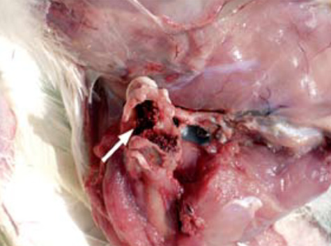 2.- La prevalencia observada de FHN, en asociación con osteomielitis, ha sido considerada por un gran número de investigadores como una de las principales causas de cojera en pollos de engorde comerciales. A menudo, en la autopsia, la cabeza del fémur fracturado está separada del fémur, y permanece en el acetábulo (flecha) en un intento de separación de los huesos.