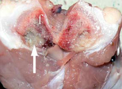3.- Sobre la base de los datos que se han recolectado en los pollos de engorde, E. coli podría tener un papel primordial en la etiología de la osteomielitis y FHN a diferencia de lo encontrado en reproductores de pollos de engorde en crecimiento donde participó principalmente S. aureus. Necrosis (flecha) y pérdida de la parte metafisaria del fémur (f) en la osteomielitis.