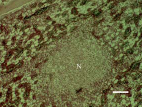 6.- Las lesiones discondroplásicas podrían desempeñar un papel en la necrosis bacteriana y, por consiguiente, de la osteomielitis. Se ha pensado también que los cambios inducidos por la desnutrición y la osteoporosis tiene un papel importante como factores predisponentes. Focos necróticos claramente delineados (N) en la zona del hueso medular, H / E, bar = 33µm.