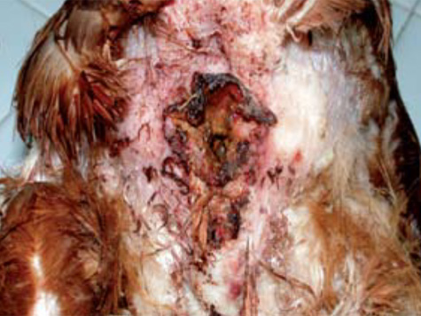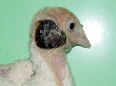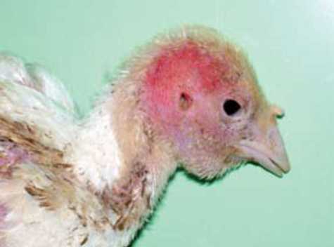 4.- Formación de costras después del picoteo en el área de la cabeza de un pavito. La prevención del canibalismo puede ser hecha administrando dietas adecuadas (es preferible el alimento molido) reducir la intensidad de luz, evitar la sobrepoblación. Una medida extrema es el despicado.
