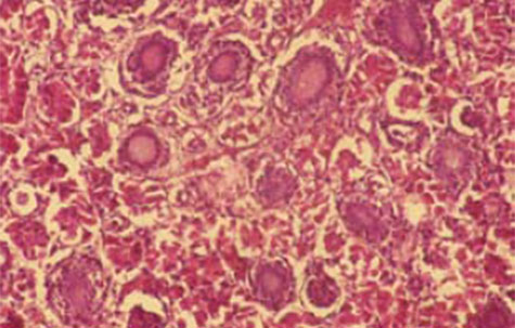 10.- Gota visceral. Sección transversal de los riñones en el pollo. Depósitos de urato en el lumen de los túbulos renales formando cilindros de urato.