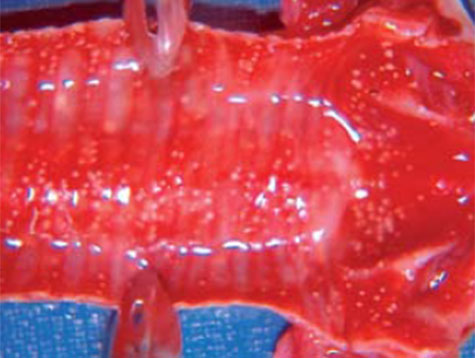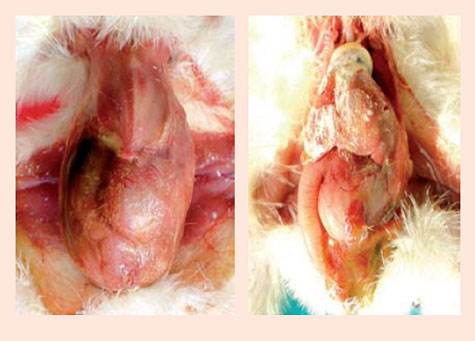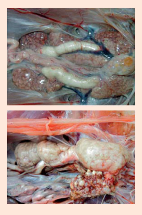 7.- En casos crónicos, las precipitaciones de uratos pueden ser observadas en la tráquea, la cresta, las barbillas, etc.