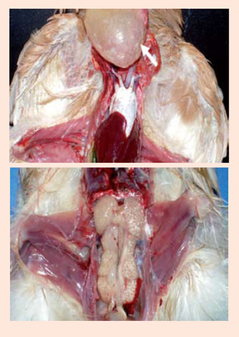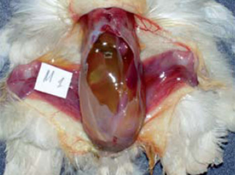 3.- El balance osmótico de las células está afectado debido a influjo de agua y la vacuolización de la célula. La ascitis (foto 3) y la retención de agua en el buche (foto 1, flecha) son signos característicos en aves en crecimiento.