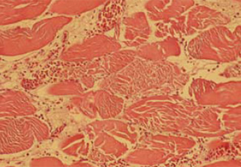8.- Hialinización (necrosis de Zenker) y lesiones necrobióticas degenerativas severas del músculo estriado. Grupos de heterófilos y macrófagos rodeando las áreas necróticas. El diagnóstico está basado en la historia, signos clínicos y lesiones macroscópicas y microscópicas. El diagnóstico diferencial se realiza con botulismo y deficiencia de vitamina E y selenio.
