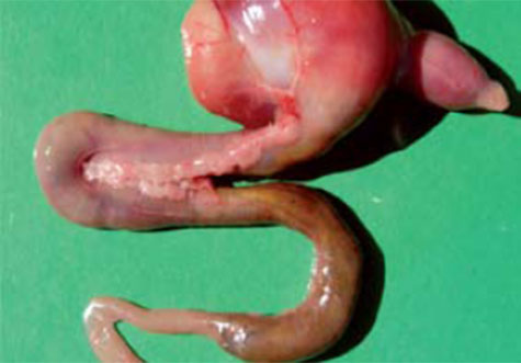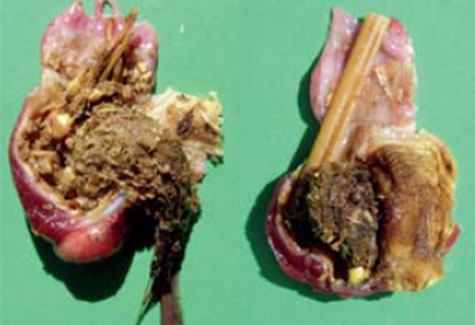 2.- En algunos casos las masas fibrosas entran en la primera porción del duodeno o las partes bajas del intestino delgado. La impacción es el resultado de la ingestión de cama que la molleja no puede ingerir. La prevención está dirigida al control de la ingestión de la cama.