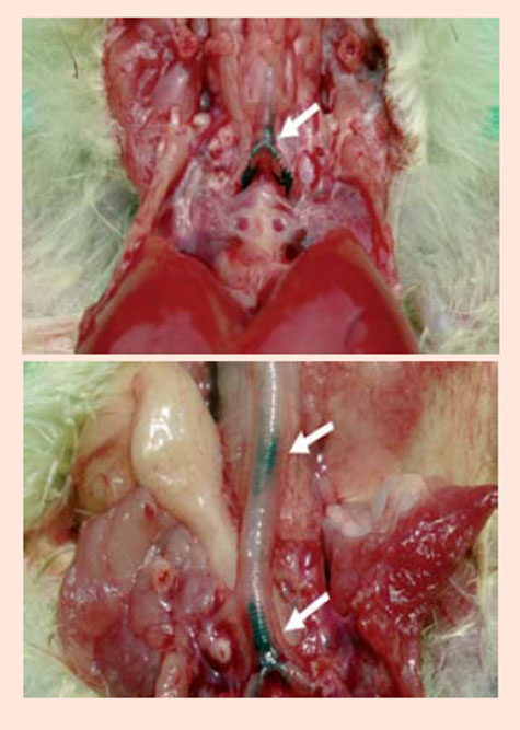 1, 2.- En algunas ocasiones, después de la utilización de vacunas en aerosol, se pueden observar lesiones obstructivas en el tracto respiratorio superior durante los primeros días después de la eclosión especialmente cuando el tamaño de la gota de pulverización es demasiado pequeño y los galpones están polvorientos y llenos de humo. La irritación de la mucosa del tracto respiratorio produce exudación serofibrinosa o serosa. Cuando el exudado coagula, las lesiones obstructivas macroscópicamente visibles en la tráquea y los bronquios principales se forman principalmente en el área de la siringe, produciendo asfixia.