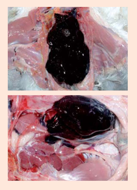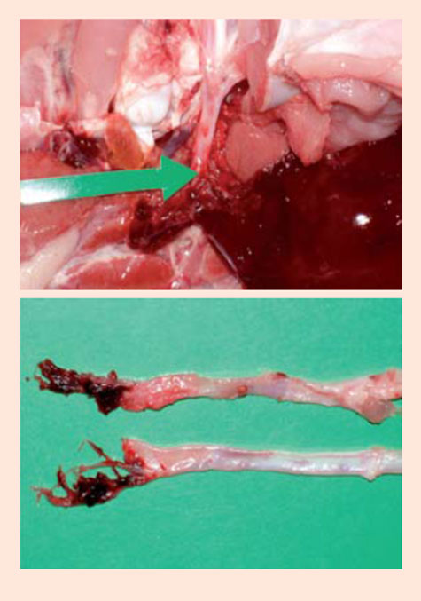 1, 2.- Un caso de ruptura espontánea de la arteria caudal renal en pavos de engorde observada a la edad de 8 a 12 semanas. Algunas aves, en condiciones de salud excelentes mueren. La carcasa se encuentra anémica. La necropsia muestra que en ciertas aves, la cavidad abdominal está llena completamente con sangre coagulada (1), y en otras, se observa coágulos masivos sub capsulares en el lado del riñón afectado (2).