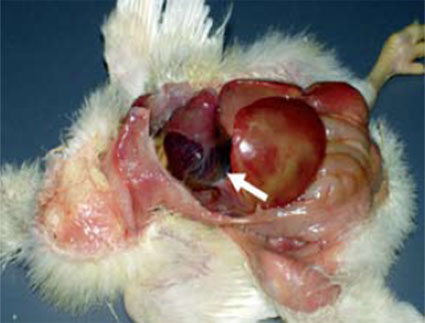 2.- A la necropsia, se encuentran grandes cantidades de fluido transparente amarillo pajizo en el saco pericárdico–hidropericardio (flecha) y en el abdomen (ascitis).