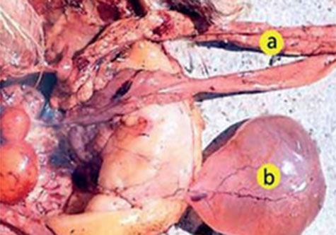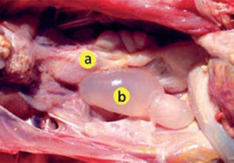 1, 2.- Si no se produce la regresión del ducto de Mullerian derecho, que está presente en las pollitas hembras como oviducto, se observa una dilatación quística de esta estructura, la cual puede variar en talla como una formación cística larga a un saco grande lleno de fluido: