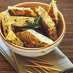 - Cut the frittata into small rectangles or diamond shapes, garnish with fresh herb sprigs and serve warm.