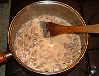7. Stir in the creme fraiche then add the brie pieces and bring to a slow simmer stirring all the time.